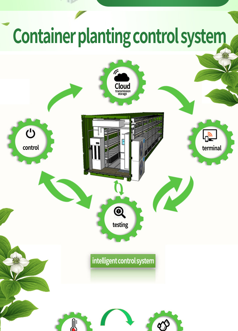This hydroponic plant system is an efficient method of growing plants without soil. The system provides nutrients to plants suspended in a closed enThe container plant factory is an innovative agricultural production model that places the plant planting and growth process in containers. This kind of factory usually uses advanced control systems, including automatic irrigation, light control, temperature and humidity regulation, etc., to simulate the environmental conditions most suitable for plant growth. Advantages of this plant factory include: Location flexibility: Containerized plant factories can be established anywhere in the city without the need for large tracts of land, thereby being closer to markets and reducing transportation costs and energy consumption. Seasonal independence: Due to the control of the indoor environment, this kind of factory can produce crops at any time throughout the year without seasonal restrictions. High water resource utilization efficiency: By recycling water resources and precise irrigation control, containerized plant factories can achieve efficient use of water resources. High yield and quality stability: Due to the high degree of environmental control, this type of plant can achieve high yield and crop quality stability, thereby improving production efficiency and quality consistency. Reduced Pesticide Use: Indoor environments can more easily control the spread of pests and diseases, thus reducing the use of pesticides.